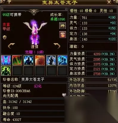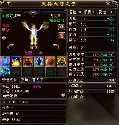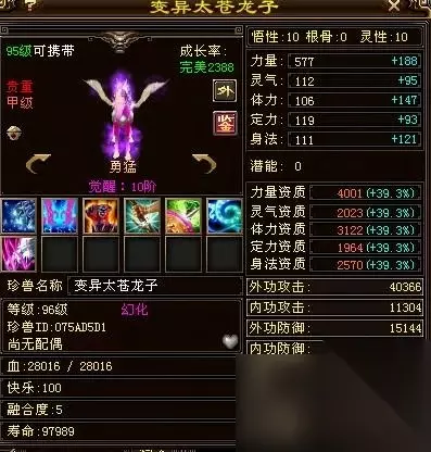 这也是一只六级变异的太苍龙子宝宝,大完美2388的成长率,勇猛的性格,灵性10级,悟性10级,力量资质4001,这只宝宝是一位卡88级的玩家手里的宝宝,按大群刷怪宝宝打造的,很拉风的卡机宝宝。