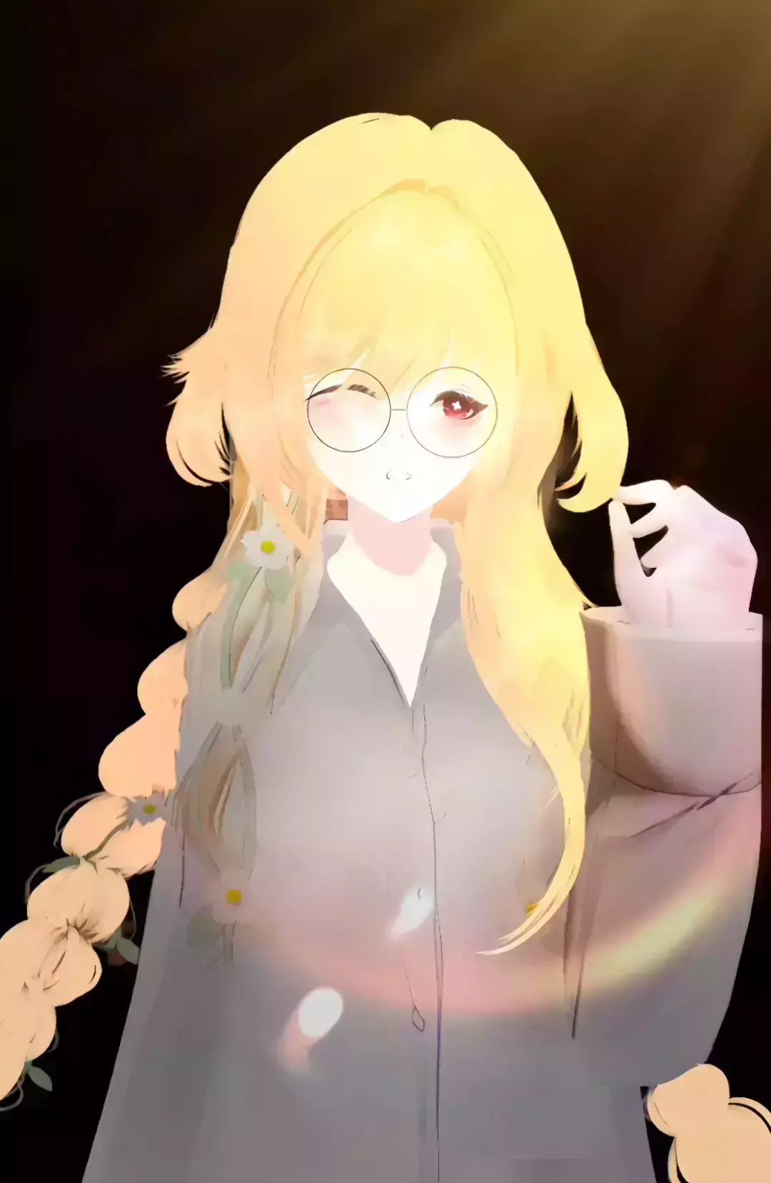 这是一篇创作者分享的原创二次元插画作品帖,展示了金发二次元少女插画的创作过程与成品,成品里少女身处花海间,创作者还为作品添加了光影吞色效果,风格治愈温暖。