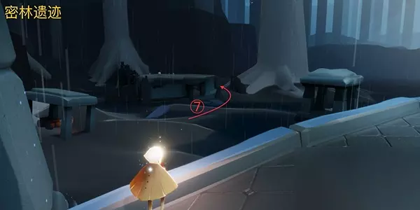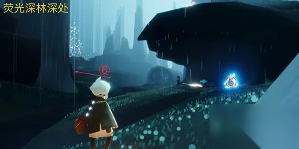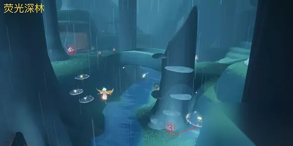 3、穿过铁门来到荧光深林,在这个地图里面可以直接看到左侧第二个亭子里面有亮光,这就是第二个先祖。