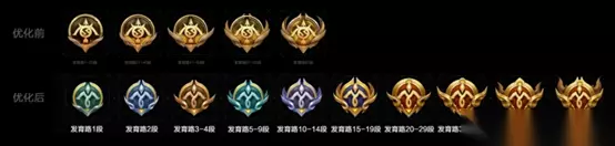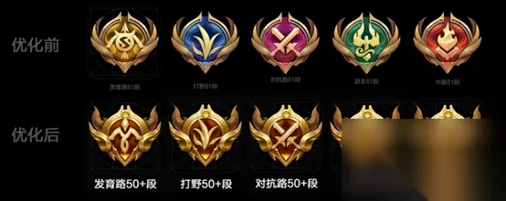 优化前的分路段位图标色调和版型单一,仅仅依靠图案辨识度不高。优化后将各个分路的徽章,根据金/蓝/紫/绿/红这五种颜色分开,辨识度更高了。50+段之后的分路徽章,才配得上镀金。