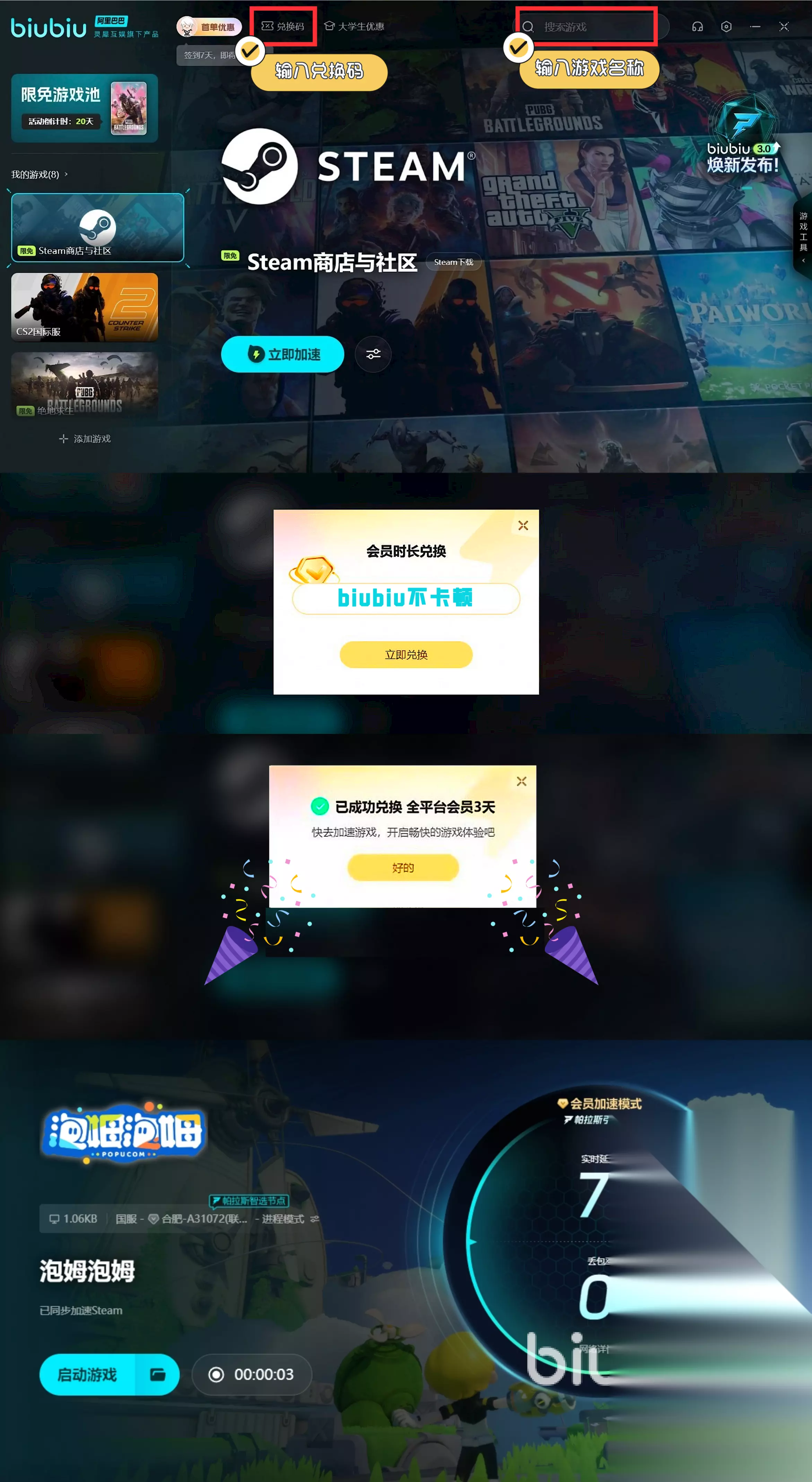 对于一些希望能解锁更多加速福利的朋友而言,其实还可主动来点击兑换,然后借助其口令【biubiu不卡顿】,这样一来所有平台用户均可顺利领取到72小时加速,助力自己去获得不错的体验。