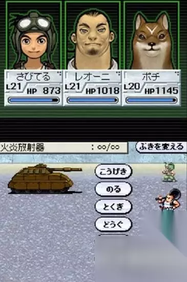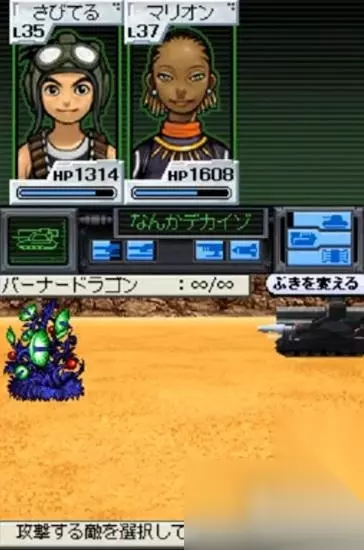 上屏主要显示人物状态 平台虽然发生了变化,但由于本作从头至尾都有系列开创者宫冈宽的参与,所以从内容上讲其实与最初的两作联系更加紧密,在特色系统等方面也更加传统。另外本作主人公被设计为一代男主角的儿子,为了阻止将自己的分身放进“诺亚种子”的超级电脑而继承已故父亲的意志,再度驾驶战车与伙伴们一起踏上拯救人类的旅程。这一设定使得游戏里的时间跨越几乎和现实中一样长,给人一种奇妙的感觉。