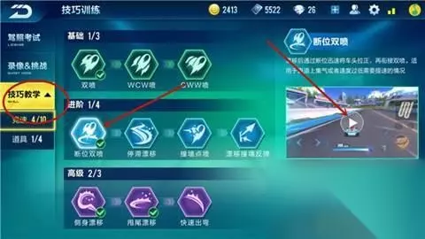 【心得】 断位双喷其实非常简单,车友们可以在主界面找到【训练模式】,进入【技巧教学】,在进阶中选择【断位双喷】技巧,点击视频观看教学,之后车友们可以点击【开始训练】来进入训练场。车友们不需要担心自己学不会,多多使用漂移技巧,之后逐渐改变自己漂移的习惯,相信大家很快就能够学会断位双喷了。