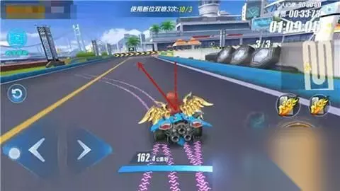 第三步:按下左(右)向键,再次按下漂移键进行断位拉车头。(如果不按下漂移键则只会拉车头却不会进行断位,这样就只能进行一次小喷,无法达成断位双喷。)