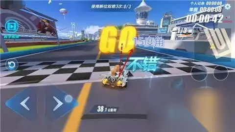 【起步断位双喷】 第一步:首先点击小喷键完成超级起步,起步的同时按下左(右)向键,漂移可动范围约为15度(车头与直道的角度约为15度)。