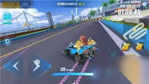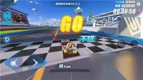 第二步:超级起步结束的瞬间按下右(左)向键,同时按下漂移键进行漂移(漂移键轻点一下后放开即可,漂移角度约为45度)。