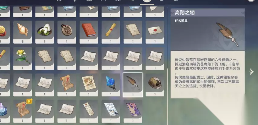 高翔之翎在琉璃峰顶端的鸟巢中,建议从天工峡传送点攀爬。同泽之枪位于天工峡字样的山顶,可直接从七天神像飞行获取。远眺之花需在丹砂崖最高处采集清心,会触发与唐无仇的战斗并开启岩巅大侠往事支线。岁时之晷在伏鳌谷的供桌上,需击败看守的盗宝团成员。