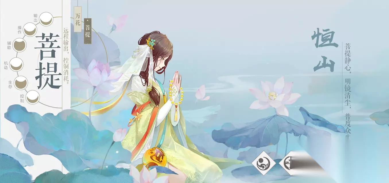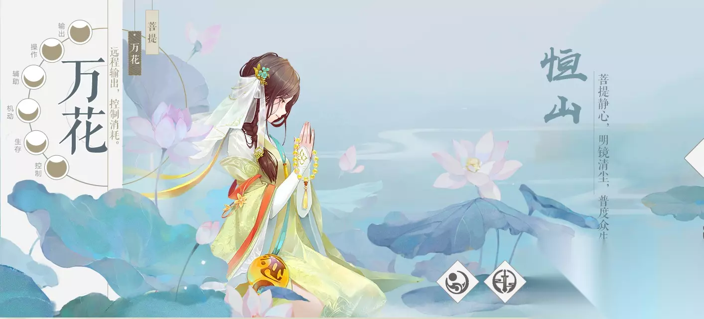 恒山万花:远程控制,带有团队buff和控制技能,辅助型角色。恒山菩提:远程,治疗,奶妈非常吃香的职业