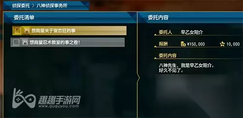 早乙女月乃 需求条件:完成章节6, 然后玩家可以来到八神侦探事务所,可以接取【想商量关于变态狂的事】,就可以跟随任务,然后来进行完成了,出现地点就是异人町的口袋咖啡厅。