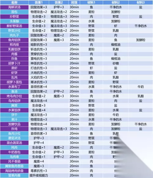 (小提示-使用ctrl+f即可快速查找) 1、海鲜浓汤:鱼+干净的水+盐 2、面包:麦粉+发酵粉 3、炒野菜:肉+野菜+盐 4、水果酿:水果+发酵粉 5、鲜虾野菜汤:野菜+虾+干净的水 6、野菜沙拉:野菜+乳酪 7、肉丸子:麦粉+肉 8、鱼肉馅饼:麦粉+鱼+发酵粉 9、煎肉排:肉+橄榄油 10、乳酪馅饼:麦粉+乳酪 11、肉酱:肉+盐 12、炸鱼:鱼+橄榄油 13、胡萝卜汁:野菜+砂糖 14、蒸虾:虾+盐 15、虾饼:麦粉+虾 16、乱炖:肉+乳酪 17、胡萝卜面包:麦粉+野菜 18、水果布丁:水果+干净的水+牛奶 19、鱼汤:鱼+干净的水 20、烤鸟肉沙拉:肉+水果+乳酪 21、鸟肉馅饼:麦粉+肉+盐 22、腌菜:野菜+盐 23、水果馅饼:水果+麦粉+盐 24、饼干:麦粉+牛奶 25、果汁:水果+干净的水 26、发酵饮品:麦粉+发酵粉+干净的水 27、炸鸡:肉+发酵粉+盐 28、鱼肉沙拉:鱼+乳酪 29、蘑菇浓汤:野菜+干净的水 30、混合蔬菜汤:野菜+干净的水+盐 31、炖肉:肉+干净的水 32、牛奶面包:麦粉+发酵粉+牛奶 33、鸟肉串:肉+野菜 34、风干香肠:肉+鱼+盐 35、腌制鱼肉香肠:鱼+盐 36、海陆烤肉拼盘:肉+鱼 37、莹果肉酱:肉+盐+莹果