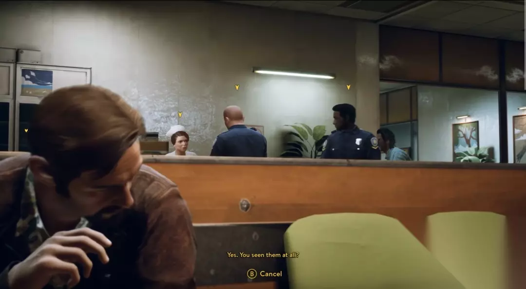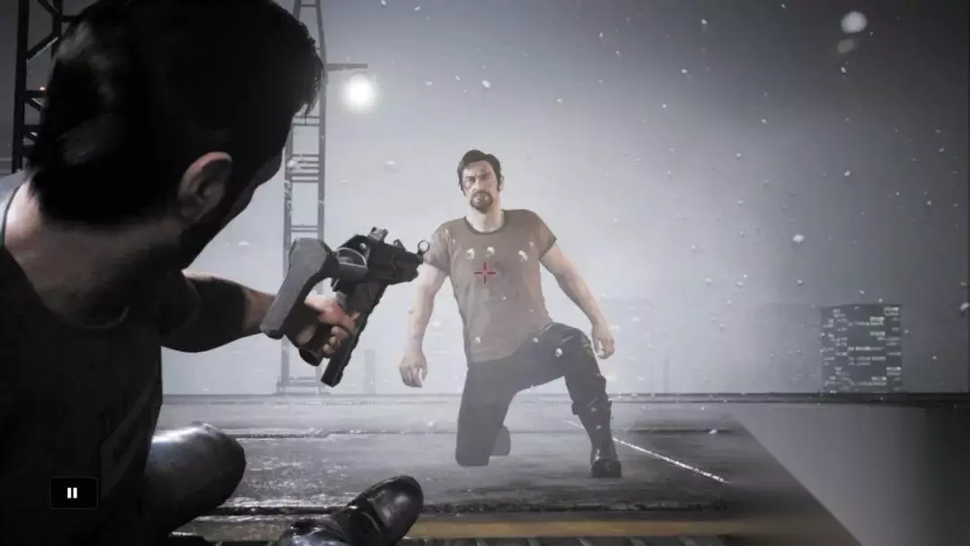 第二类 CG 摄像机,由于可以按分镜脚本预设轨道,不用考虑玩家因素,其摆放就更为艺术了。可以说,每一段 CG 的摄像机都能作为范本,你可以看到导演对场景、人物的刻画。犹记得文森特逃到医院一楼时,玩家的目标是融入人群,当文森特坐下,1/3 的镜头给到了他的大脸特写,剩下 2/3 的镜头给到了后面交谈的警察和护士。虽然文森特的大脸在前方、是焦点,但玩家仍可以观察并听到后方的对话和警察的行动。可以说,所有 CG 都是动作 B 级片层级的电影摄影范本。