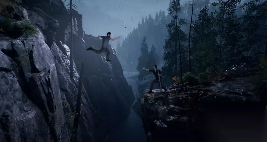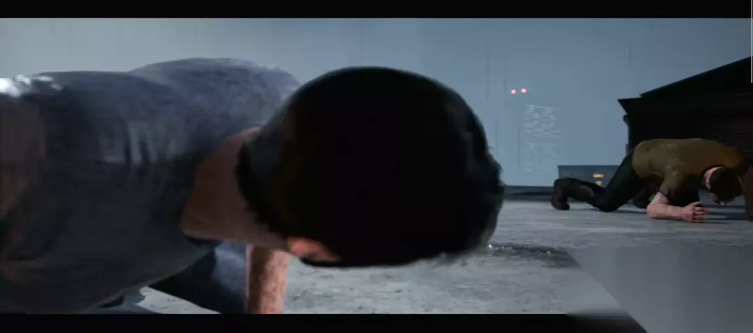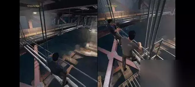 此处, 文森特死后,莱奥的屏幕逐渐往左扩张,占据了 文森特的视角 三、机位的选取 在整个游戏中,摄影机的摆放位置颇为考究。不同于大部分单调摆放固定机位的游戏,本作将电影的镜头语言运用到了游戏中。在此,我们可以简单地将游戏中的摄像机分类为:玩家游玩中的摄像机(这类摄像机会随着玩家的行为运动)和 CG 摄像机(预设好的固定轨迹的摄像机)。 《逃出生天》在不同人物动作机位的设置上进行了颇多创新。大部分游戏也有爬通风口,爬墙,踩窗户边,打架等动作,但只是直直的平移摄影,将玩家视野局限在某个固定的方向。但在本作中,摄影机被安排在不同寻常的角度,给玩家带来独特的心理体验。例如角色走过窄墙边缘时,懒惰的做法可以将摄像机直接绑定在角色身后或给侧写,而在《逃出生天》中,摄像机被架设在了斜上方,一来可以对比人物和环境,让玩家观察周边,二来可以营造出危机感。每次当莱奥走过时,他的镜头会抖动,因为莱奥这个角色本身就有恐高症。这一游戏细节和镜头设定完美地融合了。