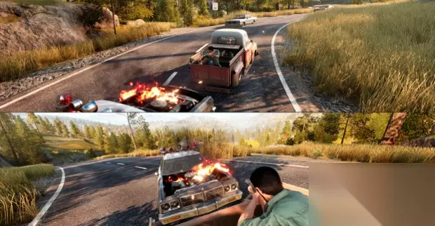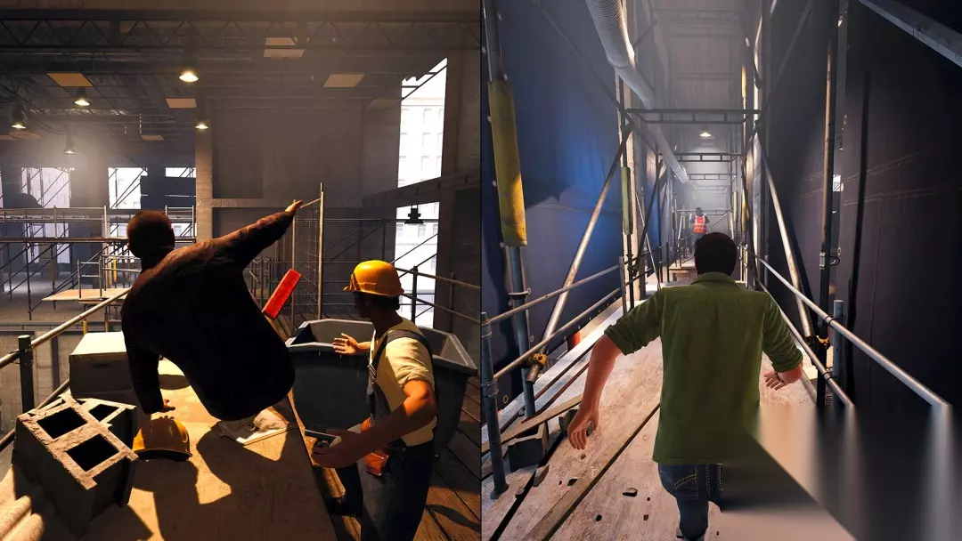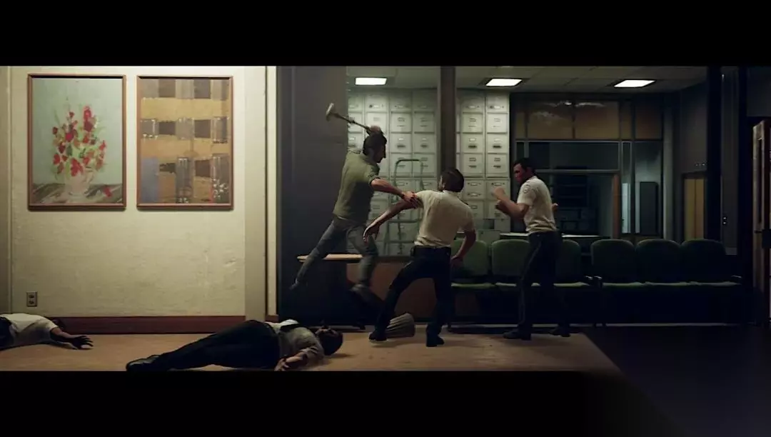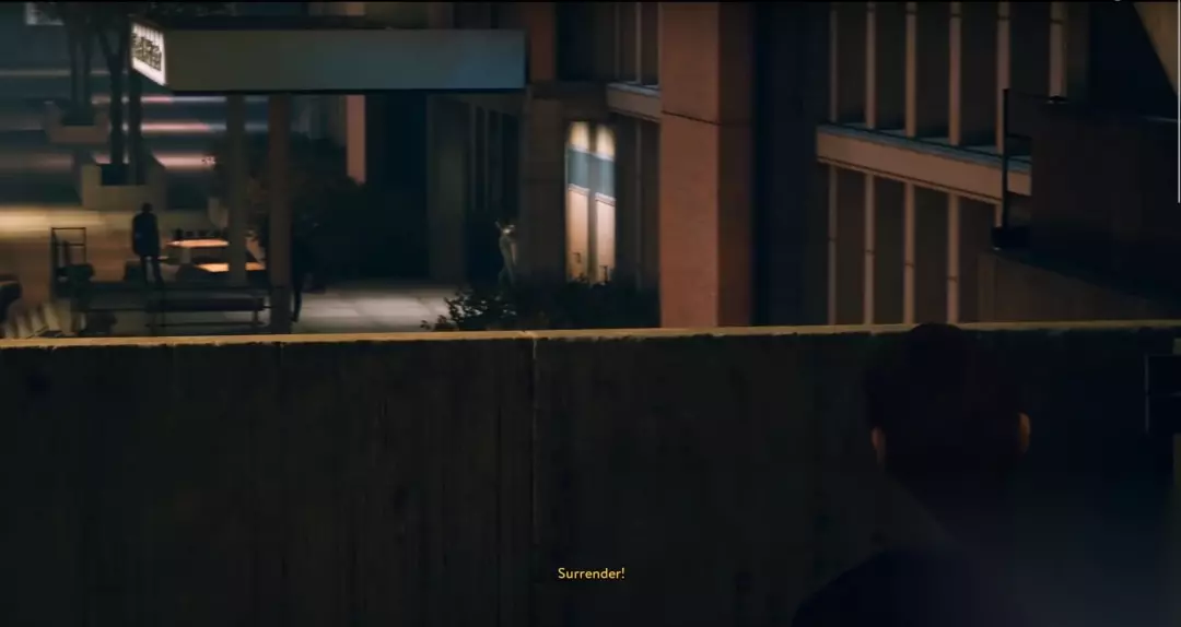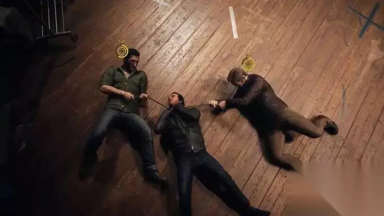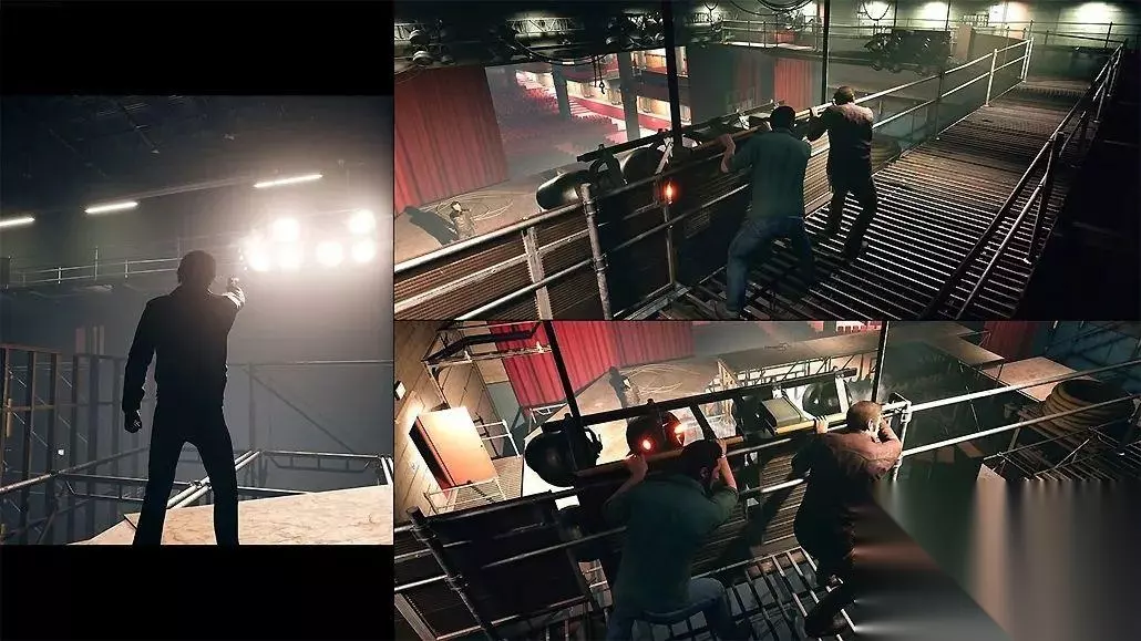 剧院追杀,镜头从二到三到一,最后两人合力一击 等到文森特(Vincent) 去医院看老婆孩子时,警察的出现让屏幕又合二为一。这一段的运镜堪称好莱坞式的经典运镜:主角们从楼上一层一层往下跑,镜头也跟随着主角们来回徘徊。最重要的是,通过镜头的移动,玩家知道两位主角自始至终都离得很近,但直到文森特找到汽车接莱奥(Leo)上车,两人才算汇合。镜头语言将这一段的紧张感展现得淋漓尽致。在这个逃离追捕的段落中,玩家需要交替对付四面八方来的警察,镜头自始自终跟随在主角背后,突如其来的警察总是会给玩家刺激。