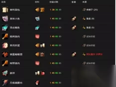 二、175-260级 食谱:石鳞鳕鱼(175-210级),食谱:银头鲑鱼(175-235级),食谱:油炸红腮鱼(225-260级)、食谱:斑点黄尾鱼(225-260级)。 可以找港务局内的凯尔希·杨斯买鱼。