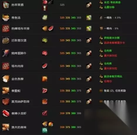 三、250-450级 部落和联盟玩家可以在塔纳利斯热砂港的吉科希斯处购买到食谱:夜鳞鱼汤(250-285级)和食谱:水煮阳鳞鲑鱼(250-285级)。 菲拉斯羽月要塞的薇薇安娜和莫沙彻营地的希恩德拉·深草分别面向联盟和部落玩家出售四种275级烹饪配方,钓鱼玩家可以用食谱:烤鲑鱼。
