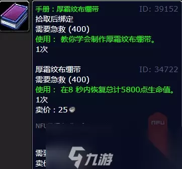 厚霜纹绷带: 400-450厚霞绞朝带- (霜纹布x2) -120 1400 40-430-4701 <公式抬绑> 技能需达390才会看得到公式 北裂境74级以上,能拾取到霜纹布的怪皆有机率掉落。 结语: 通过以上介绍,相信玩家们已经了解了在魔兽世界中学习制作厚霜纹布绷带的地点和方法。祝愿大家在游戏中能够顺利提升自己的战斗力和练级效率!
