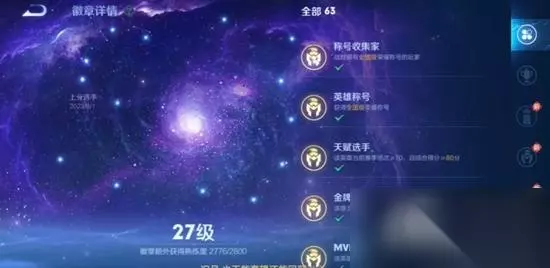 3、生涯徽章成就以星空形式展现。 4、玩家通过使用喜爱的英雄进行对局,就能解锁各类生涯徽章,每个生涯徽章可获得获得额外的熟练度。