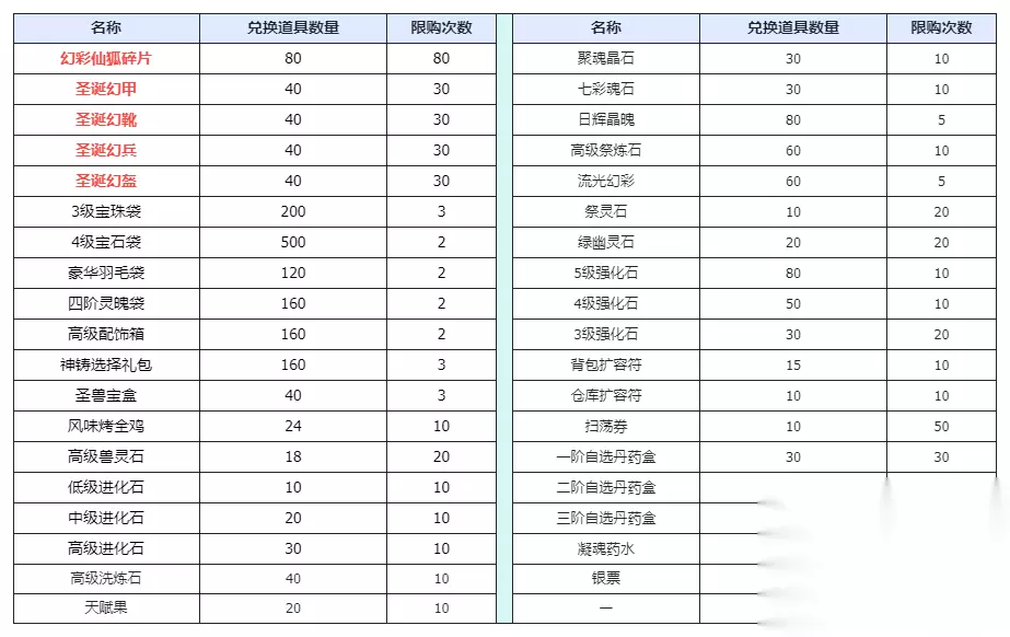 一、新增内容 1.新增圣诞节上交雪人之心活动 2.新增圣诞节雪人对战活动 3.新增双旦大兑换活动 4.新增双旦关卡掉落双倍活动 5.新增双旦登陆送豪礼活动 6.新增圣诞节堆雪人活动 7.珍宝阁限时上架圣诞节优惠礼包,限时特殊命格自选礼包 8.5星高级经文自选包限时返场 9.坐骑霸下返场 二、活动内容 【活动1:实惠拿不停 材料大放送】 活动时间:12月18日6:00至12月19日 活动内容:活动期间单笔充值达到指定金额便能够领取一份超值大礼包。 活动奖励: 1、单笔充值达到60元宝(每天限5次):蓝色精炼石*1,中级洗炼石*1,符印石*1,宝兽内丹*1 2、单笔充值达到300元宝(每天限3次):高级兽灵石*1,低级进化石*3,中级进化石*2,高级进化石*1 3、单笔充值达到680元宝(每天限2次):高级洗炼石*1,风味烤全鸡*1,天赋果*1,初级内丹宝盒*1 【活动2:圣诞送大礼】 活动时间:12月18日6:00至1月2日 活动内容:活动期间东胜神洲、北俱芦洲、西牛贺洲,须弥山,瑶池仙境,神雷玉府每个关卡中有概率出现雪怪,击杀雪怪可以获2025瑞雪丰年碎片或2025雪人之心,找到圣诞老人上交2025雪人之心可随机获得奖励,当全服上交到一定次数后可以领取全服奖励: 1、圣诞全服奖励第1档奖励(上交20000次):金砖*2,归元药水*2,2级强化石*5,背包扩容符*2,还魂丹*3,2025瑞雪丰年*1 2、圣诞全服奖励第2档奖励(上交100000次):金砖*4,归元药水*4,3级强化石*5,橙色精炼石*3,灵兽内丹*2,2025瑞雪丰年*2 3、圣诞全服奖励第3档奖励(上交300000次):金砖*6,归元药水*6,3级强化石*10,流光幻彩*3,绿幽灵石*3,2025瑞雪丰年*4 4、圣诞全服奖励第4档奖励(上交700000次):金砖*8,归元药水*8,4级强化石*5,高级洗炼石*3,初级内丹宝盒*2,2025瑞雪丰年*6 5、圣诞全服奖励第5档奖励(上交1400000次):金砖*10,归元药水*10,4级强化石*10,凤之羽*10,豪华羽毛袋*1,2025瑞雪丰年*8 6、圣诞全服奖励第6档奖励(上交2520000次):金砖*15,归元药水*15,5级强化石*5,残缺命格·橙*3,特殊命格随机包*1,2025瑞雪丰年*10 7、圣诞全服奖励第7档奖励(上交4200000次):金砖*20,归元药水*20,5级强化石*10,聚魂晶石*10,七彩魂石*10,2025瑞雪丰年*15 8、圣诞全服奖励第8档奖励(上交6600000次):金砖*25,归元药水*25,5级强化石*15,高级兽灵石*20,高级进化石*10,2025瑞雪丰年*20 9、圣诞全服奖励第9档奖励(上交9890000次):金砖*30,归元药水*30,5级强化石*20,神铸选择礼包*5,四阶灵魄袋*2,2025瑞雪丰年*25 10、圣诞全服奖励第10档奖励(上交14280000次):金砖*40,归元药水*40,5级强化石*30,4级宝珠袋*1,4级宝石袋*1,2025瑞雪丰年*30 【活动3:冬季雪人大作战】 活动时间:12月18日6:00至1月2日 活动内容:活动期间找到圣诞老人可以参加打雪仗活动,可以获得2025瑞雪丰年碎片和2025雪人之心 【活动4:双旦限时大兑换】 活动时间:12月18日6:00至1月2日 活动内容:活动期间通关东胜神州,北俱芦洲,西牛贺洲,须弥山,瑶池仙境,神雷玉府中任意一关有概率获得双旦兑换券,使用双旦兑换券可以在老板娘活动商店中兑换圣诞时装,稀有坐骑,材料等特殊物品。