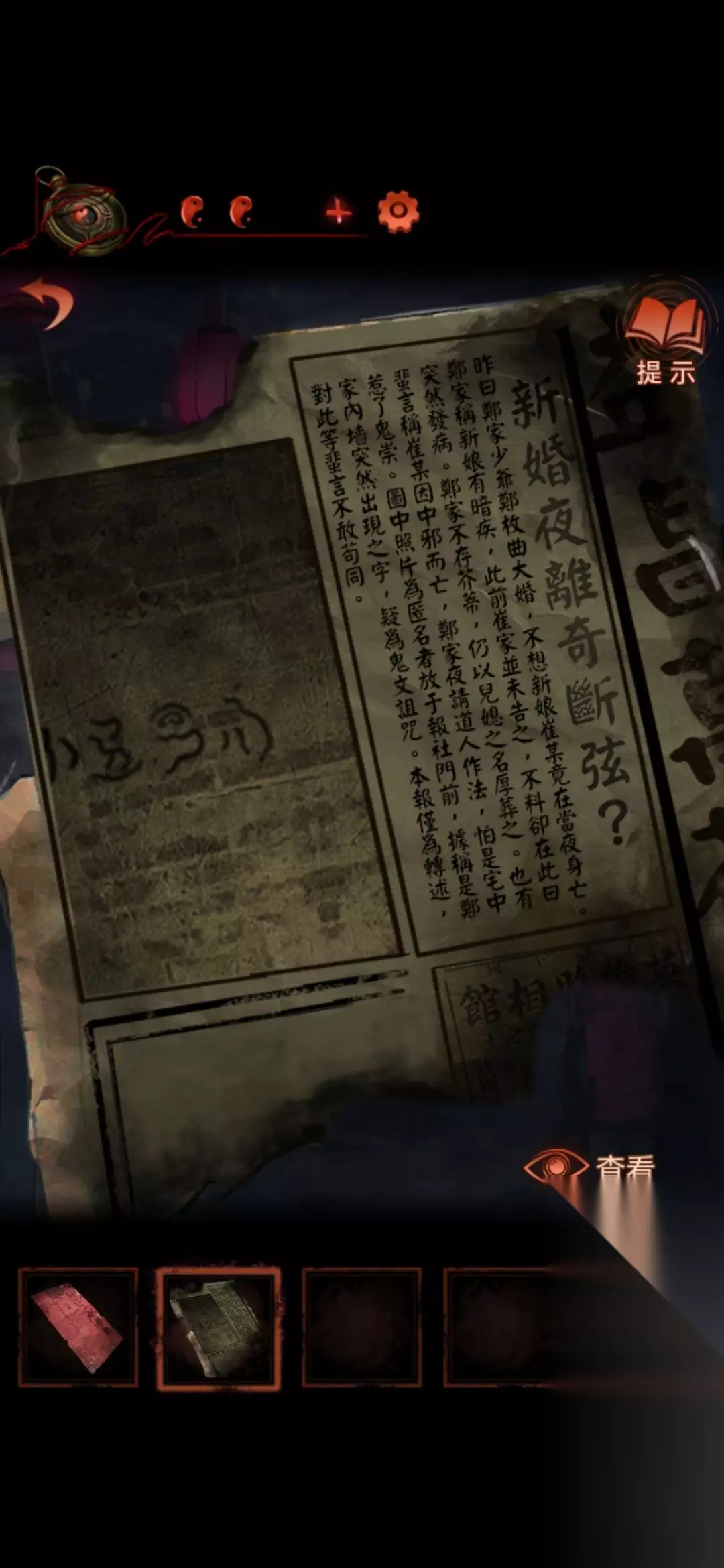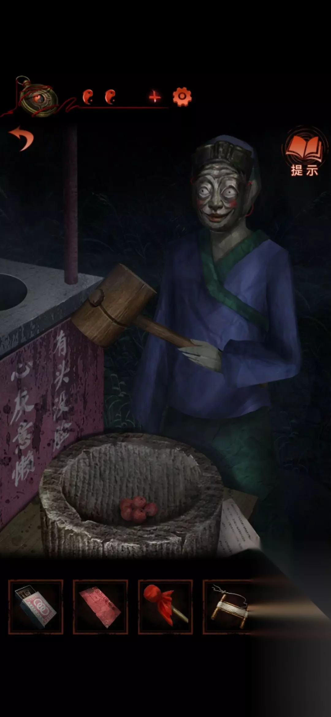 18.回到二更天(敲4下),黑白无常就烧成灰了。 接着到木偶摊子上,把红绳给木偶,得到木偶新娘。 回到中间场景,把新娘挂上去,得到报纸。
