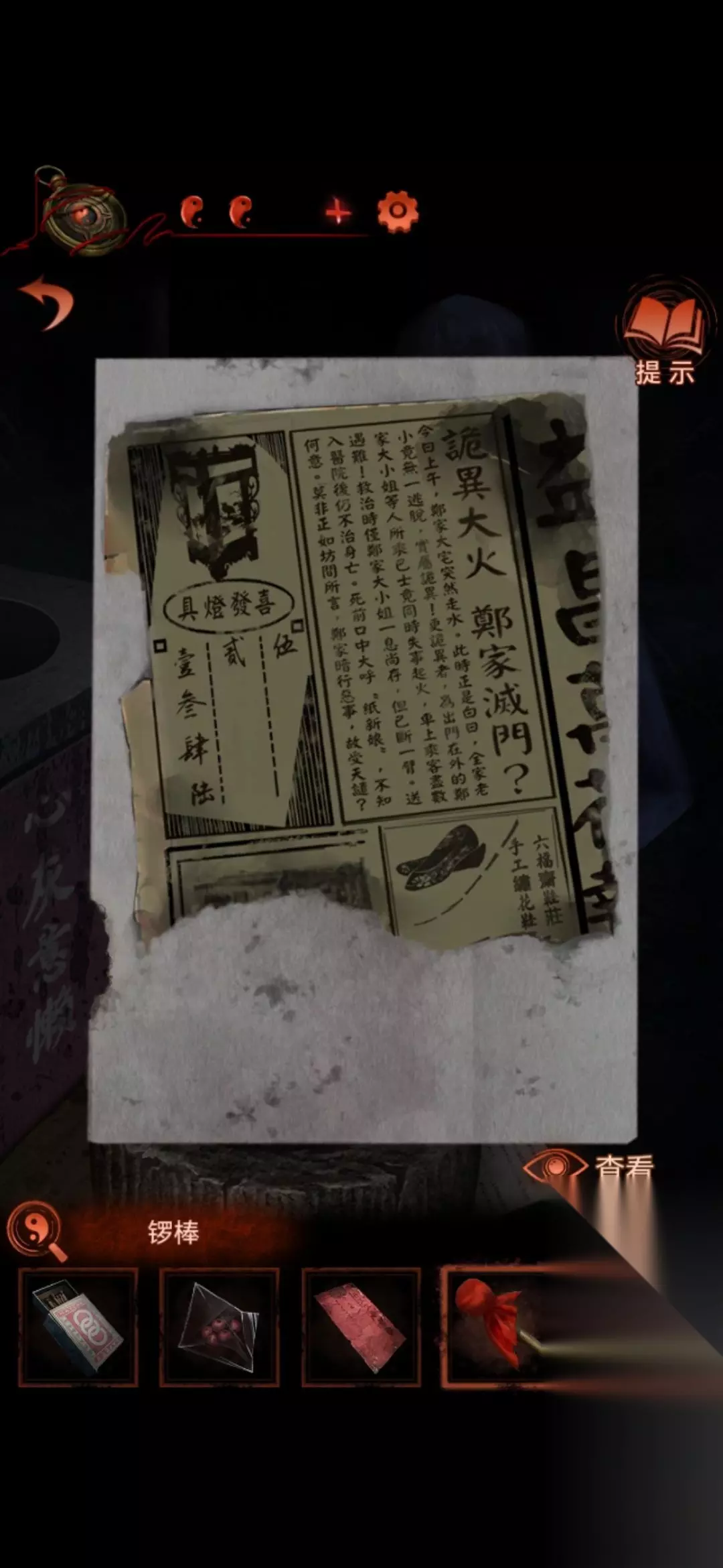 3.往前走,木偶戏提示要绣花鞋,特产铺要6个铜钱(线索比较后面,攒搁)。 4.切换到最左边场景的轿子里,得到红纸背后有生肖图案 还有绣花鞋盒。