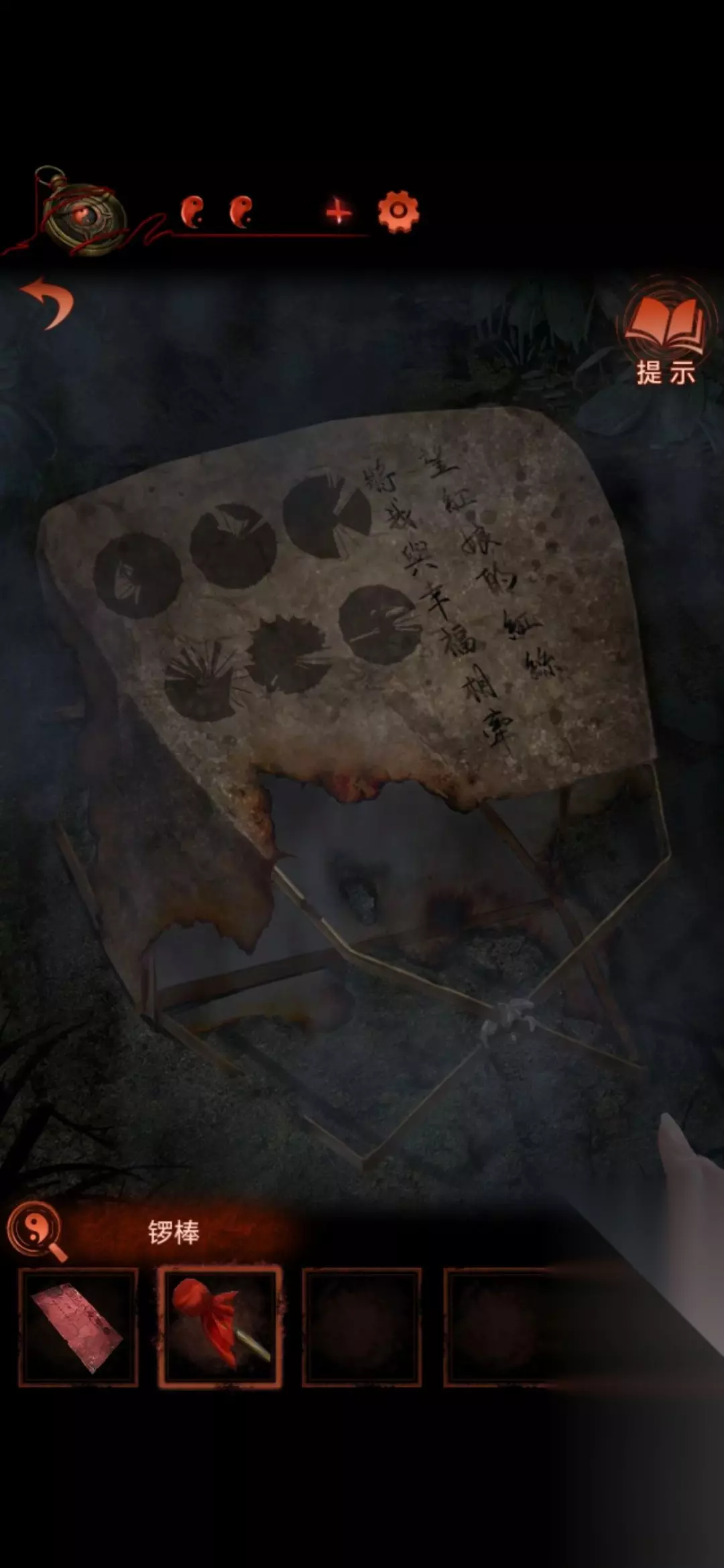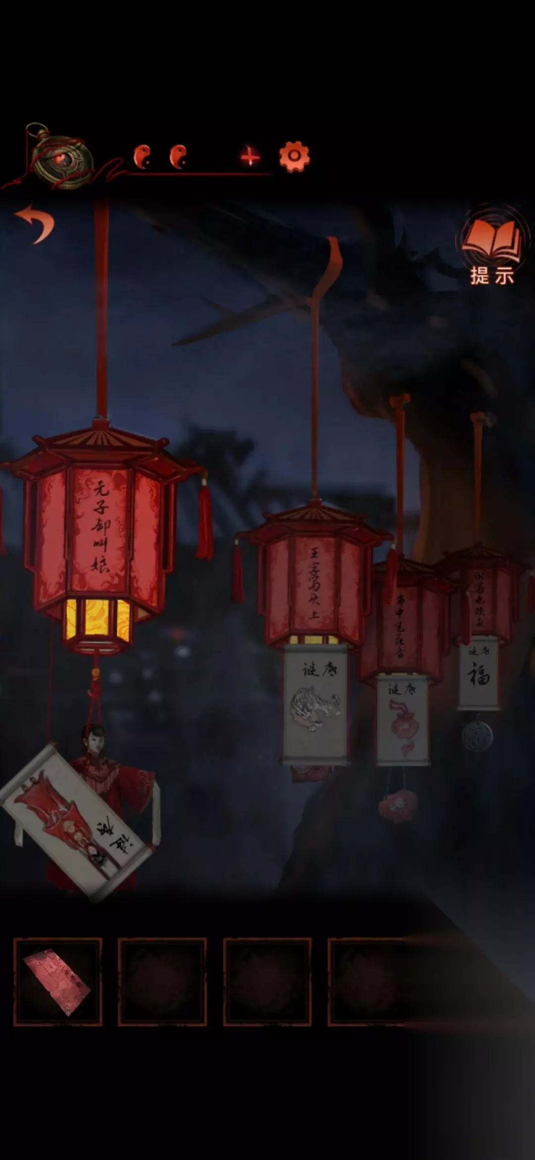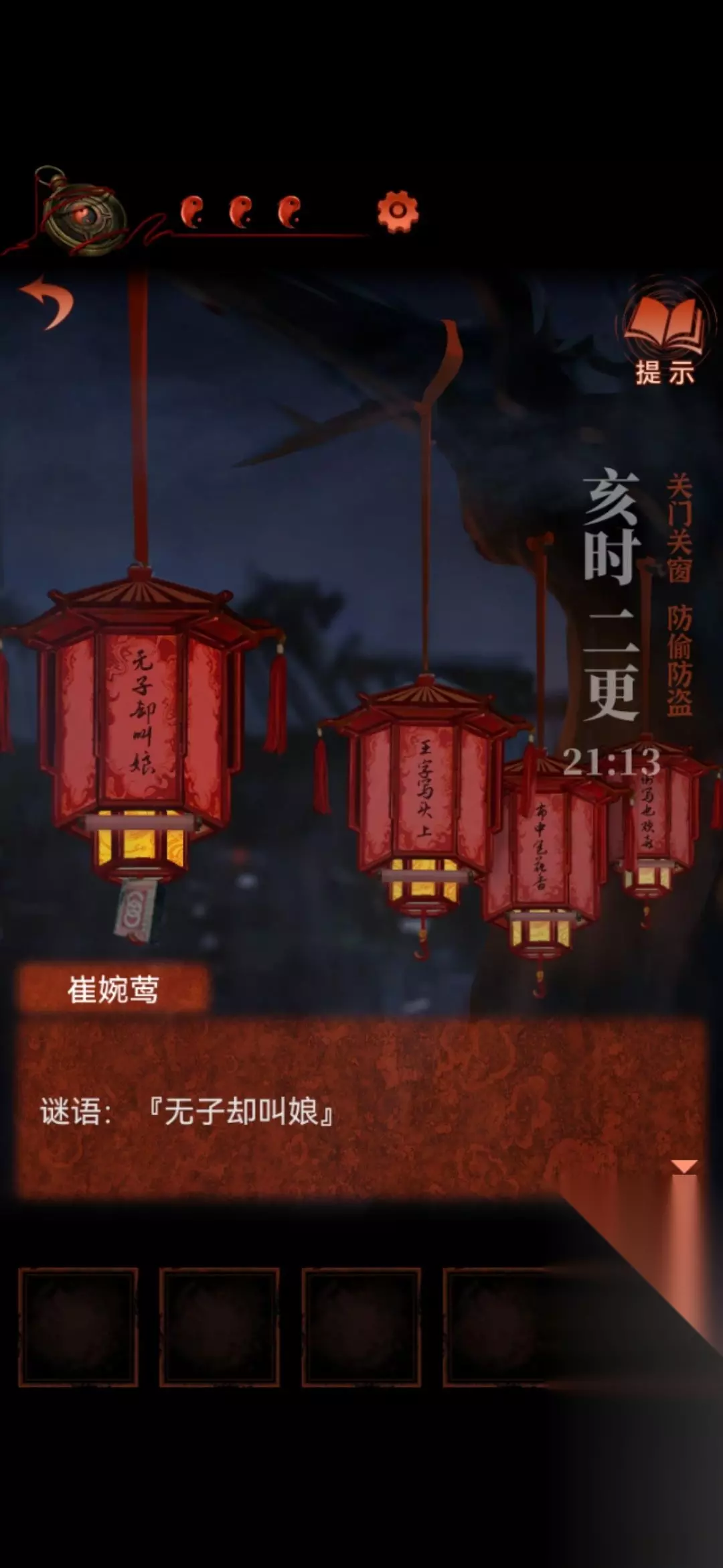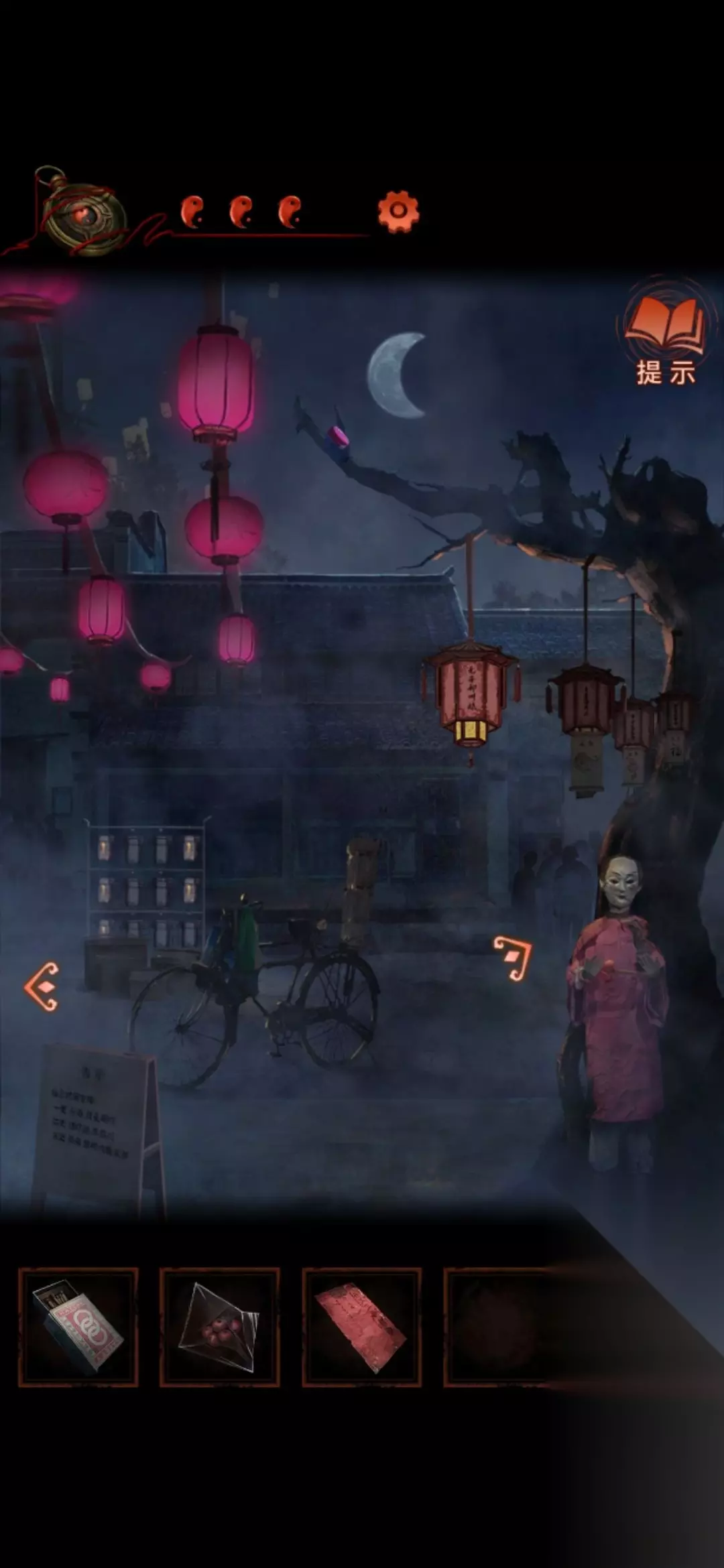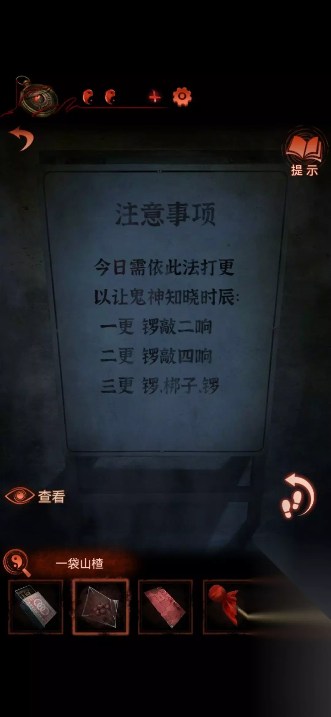 8.中间场景的告示牌,点右下角那个可以变化,得到线索。接着就可以去敲左侧场景白无常手上的铜锣。(几个灯笼亮代表几更)