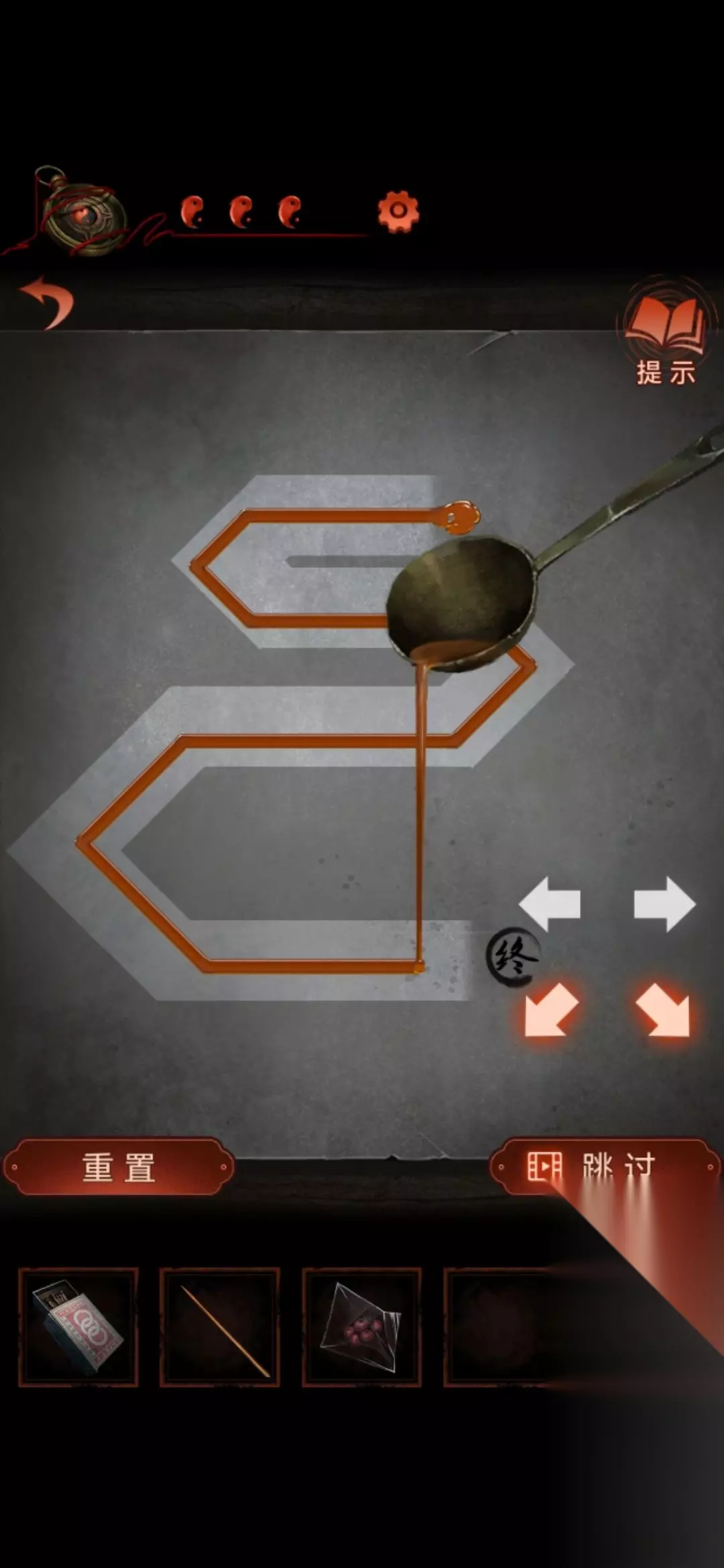 得到发现灯笼的线索,来到中间场景,按顺序左中左左右左得到剪刀和金元宝。