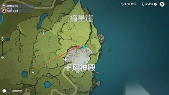 2.星落湖-【守护神像的湖泽】 位于星落湖右下的半山腰,可按图所示传送到雷本“仲夏庭院”再一路向西。跳下来即到。