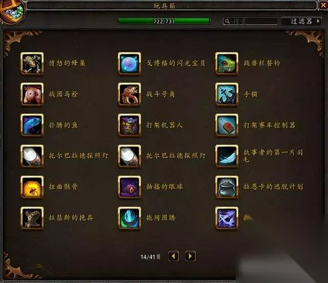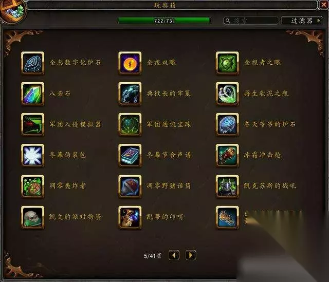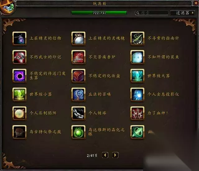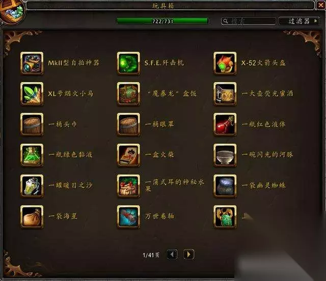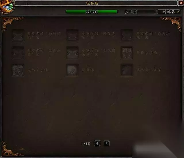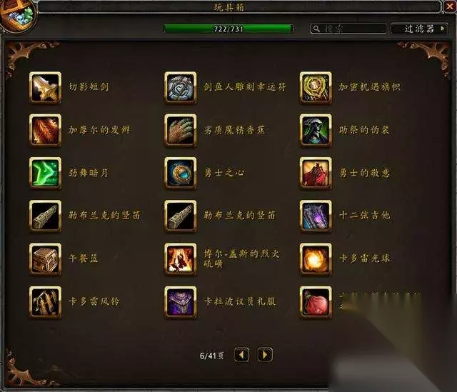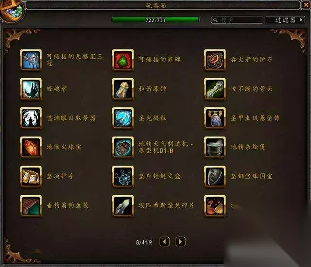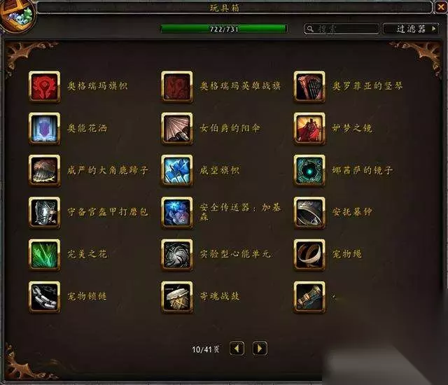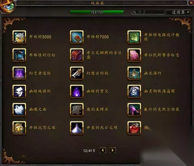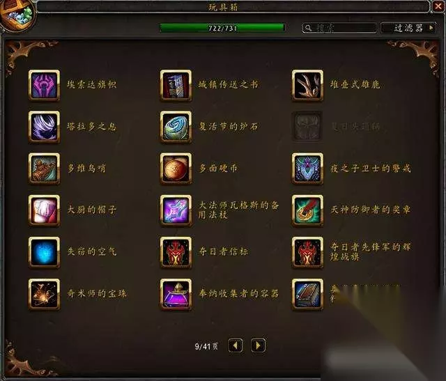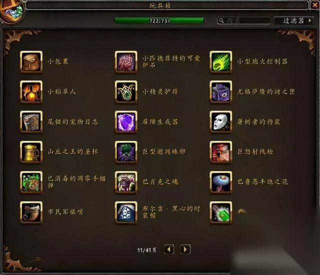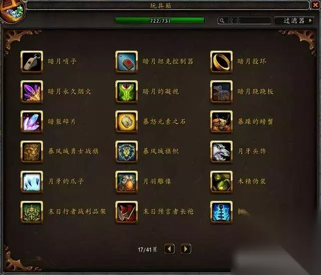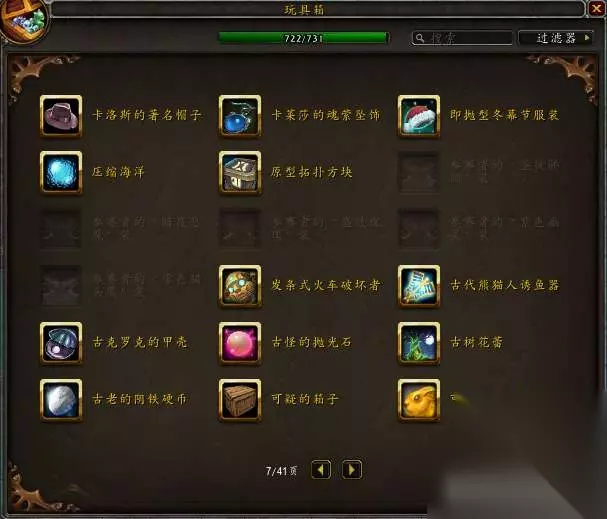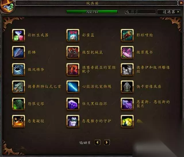 目前国服玩具极限上限是733,水蓝目前上限是731,没有单头食人魔和鱼人服装。 隐藏玩具一共60个,那些从未在国服出现过的玩具不在讨论范围。 这是水蓝未收集的玩具:其中3个9.1.5版本加入的火焰节玩具要等下个月才能入手~