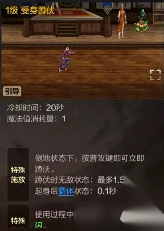 三、防御技巧: 1、受身蹲伏和疾闪的配合使用 受身蹲伏在被对手击倒后可以使用,倒地状态下按住该技能不放可以在短暂时间里处于下蹲无敌状态,躲避对手的后续技能,配合使用疾闪能够快速拉开安全距离。