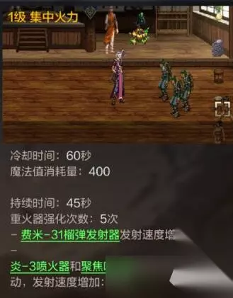 四、核心技巧讲解: 1、集中火力的应用 集中火力施放后可以让重火器速度发射速度获得大幅提升,并且能取消重火器的后坐力,在找准连招时机情况下,能用重火器技能组合的连续技对手造成高额伤害。