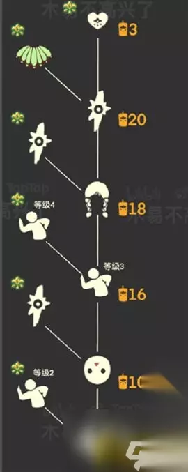 ③最后靠近点燃他即可。 【傻笑童子军先祖护送路线】 点燃先祖,从树屋旁边的大树,把他护送到河边的大树后面,有两条路可以走。 兑换图 1、兑换物品:背带裤、树枝面具、木头圈、傻笑动作。 2、兑换价格:总计需要66根季节蜡烛。