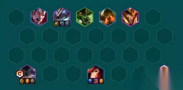 2、阵容站位 前排站主宰抗伤害,尼菈站在狗头身后,有薄暮法袍减护甲可以加强尼菈的输出。亚托克斯来了换沃里克,普朗克来了换厄运小姐。