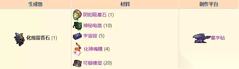 是一个月亮领主后可制作的饰品。它能使玩家拥有沿墙下滑、双击方向键迅速冲刺38格基础物块的距离,按住跳跃键时允许自动跳跃。 此外,玩家还获得每过90秒一次的必定闪避能力。冲刺时,轨迹上会留下三个可以追踪敌人的宙能镰刀,造成375点基础伤害(受全职业伤害加成)。它同样会使玩家免疫摔落伤害。 10、化绵留香石