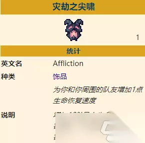 是一个月球领主后可以制作的饰品。它为玩家提供增加10%伤害减免,+30最大生命值和魔力值,增加5%移速和跳跃速度,站立不动时会增加生命及魔力恢复速度,敌人击中你时会受到伤害,受到伤害时释放一大片蘑菇孢子能够吸收敌人6.25%的伤害值并转化为治疗效果。 11、灾劫之尖啸(全方位属性增幅的饰品)