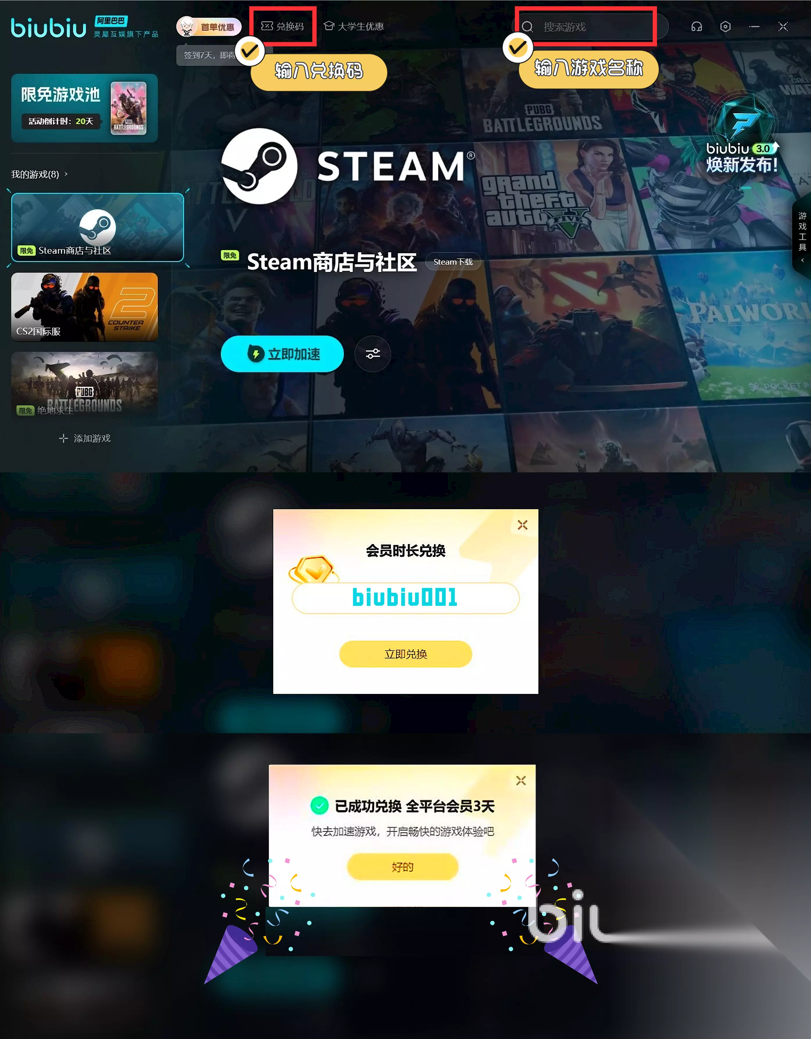 玩游戏总是卡?那是时候让biubiu加速器登场了!新注册账号就能轻松领取3小时加速时长,快速开启畅玩模式。更刺激的是,使用兑换码【biubiu001】还能再获得72小时加速时长,轻松提升游戏体验,秒到账!无论是新玩家还是老玩家,都能畅享这一福利,完全没有门槛。合起来,新用户一共能拿到75小时的加速时长,游戏不再掉帧,网络飞速畅通,畅玩才是王道!快点领取这些超值福利,游戏不卡,才够带劲!