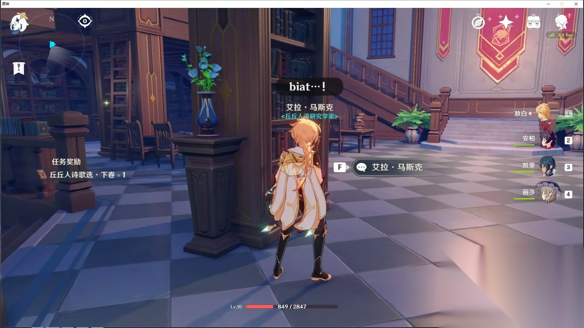 对话给染血骑士之杯(四星高级装备)。 5.艾拉·马斯克(在骑士团右房间图书馆)