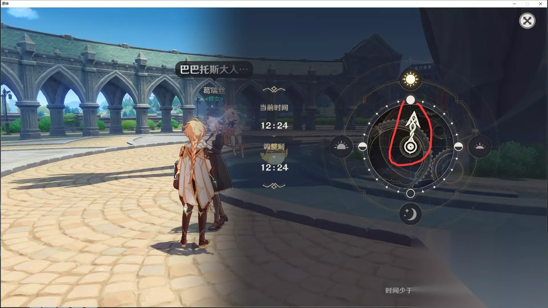 《原神》蒙德城送物品的人物介绍: 在某些时候NPC不在那个位置可能是因为游戏时间晚上了,这个时候可以在游戏中设置时间为白天或者其他时间 挪动时针,调整到你想要调整的时间。