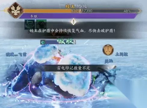 血量过半时,蛙王会释放【冬眠】自身施加一个护盾,持续期间会持续回血,全力打破护盾。