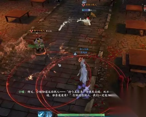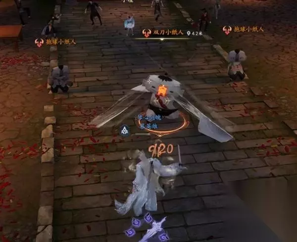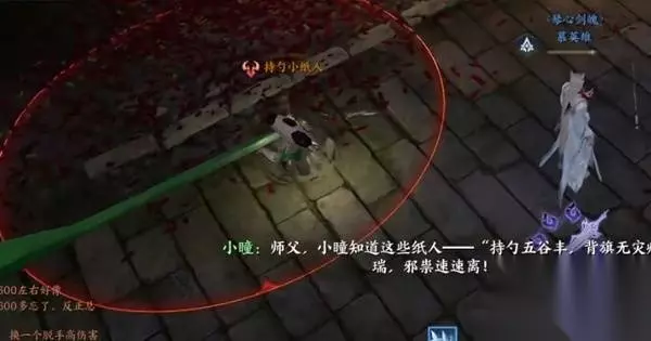 击败后,继续带上面具跳舞。 接下来出现的是双刀小纸人和抱球小纸人 抱球小纸人会选中一个玩家一直攻击,奶妈注意抬血。 双刀小纸人会释放【刀波】T引导刀波避免攻击到人群即可。