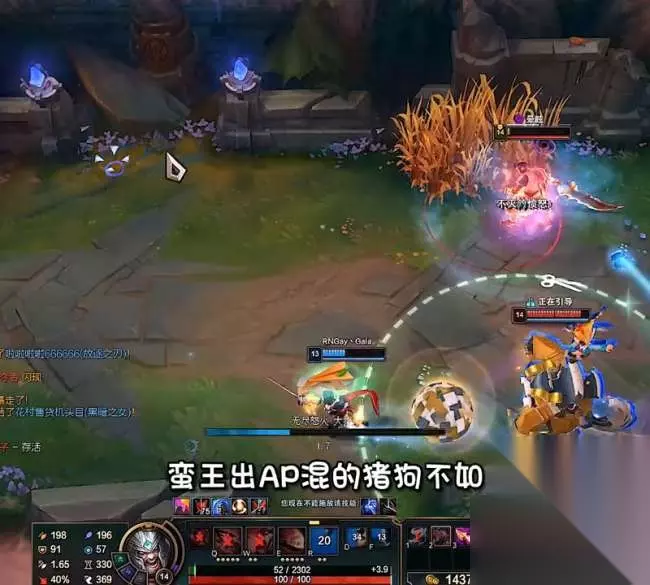 无限火力AP偷家蛮王。 我刷到了一个AP偷家蛮王的视频,就是一个蛮王挂着一只猫咪,无兵线偷塔,对面五个来抓都抓不到蛮王,没血了一个qO一大半管,然后绕一圈大招又好了继续偷,把对面耍的团团转,不知道你们刷到没有,反正我看了就来了兴趣,所以就来试验一把,看我现在两件装备被螳螂打的狼狈不堪。 我是发现了蛮王出AP前期根本没伤害,拿个头都是想屁吃,AP蛮王只能偷经济,偷点兵线偷点野怪,对面来人直接跑。因为AP蛮王是谁都打不过,我感觉剑姬偷塔效率都不知道高我多少倍了。而且一般的英雄还打不过剑姬,我1/3的血必须开大招,我伤害没伤害身报还脆。蛮王出AP混的猪狗不如玩的我实在太窝囊了,难道真的看视频只图一乐吗?