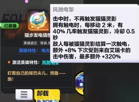 激活风驰电掣特性 注意看,他是移动2米40%概率,而本身我们的特性是移动1米30%概率,不知道是不是文字性错误,还是原本就这样,这个我稍后会向阿宽进行反应。 上面我们提到的重点,0.5秒内只要保证足够多的击中,就一定能触发猫猫灵影,而这里也同样,只要我们跑的足够快,我们也一定能触发猫猫灵影(脸黑当我没说)。 核心遗物