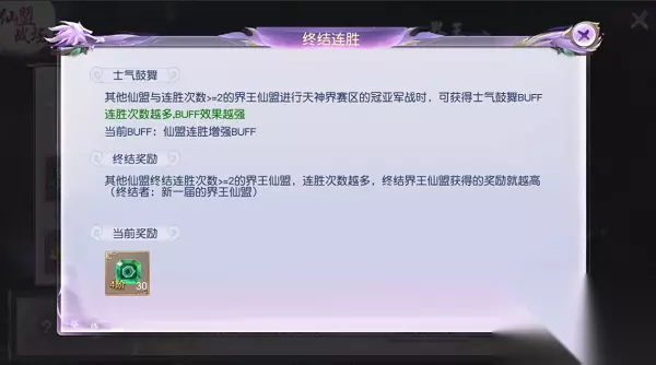 如果一个仙盟连胜了很多次,为了避免出现垄断局面,那么在天神界赛区决赛时,对与其进行决赛的队伍是有BUFF加成的,且界王神殿仙盟连胜次数越多,BUFF效果越强。