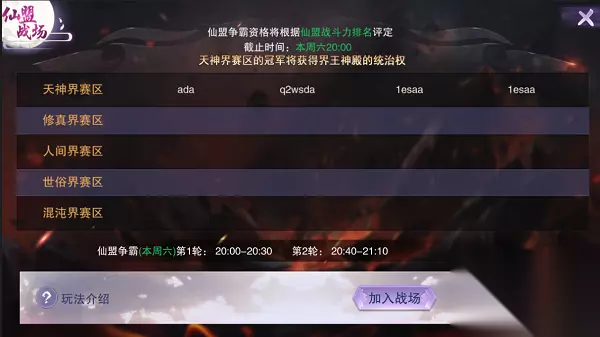 t15_2-t15_1:5.0 一个仙盟是一个团队,而仙盟争霸活动则是考验一个团队的最好时机。仙盟争霸活动于每周二每周四每周六开启,第一次仙盟争霸根据仙盟战力的排行,分为天神界、修真界、人间界、世俗界、混沌界5个赛区,每级四个盟。混沌界的仙盟取除开天神界、修真界、人间界、世俗界四级仙盟外最高战力的四个仙盟。
