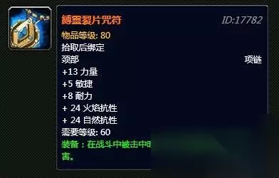 Top4 缚灵裂片咒符 话说在2005年的3月23日,美服Achimonde的Nurfed正在进行MC的raid活动,在它们击败了迦顿男爵之后,掉落里出现了这条传奇项链。这条项链当时被分给了一名叫Noktyn的玩家,他当时是Nurfed公会的一名坦克。据说装备了这条项链之后身上会出形同萨满闪电盾的特效。 当时这条项链是确实存在在迦顿男爵的掉落表中的,在这名幸运玩家获得了这枚项链的同一天,暴雪发出一个hotfix,把它从掉落列表中删除。但是暴雪却同意保留Noktyn身上的项链,使得它成为非公认的,世界第一件传奇装备。