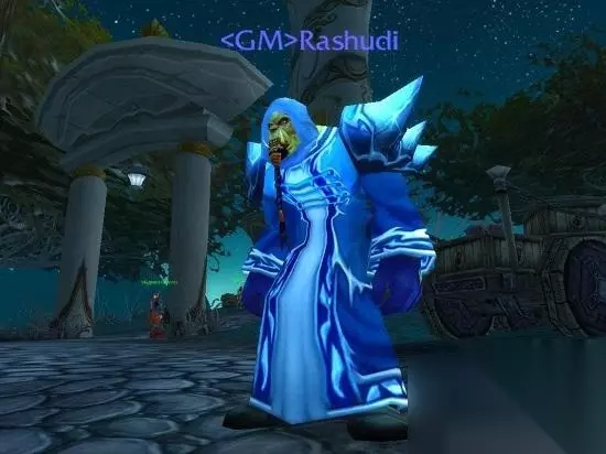 Top2 游戏管理员(GM )套装 名副其实,这套装备就是GM的专属套装。分为三件套:帽子,长袍和鞋子。蓝黑相间的配色是暴雪的标志色,而且这套服装的设计是独有的,有很高的识别度。 《魔兽世界》中的GM可谓是所有网游中最尽职尽责的GM,它们7×24为玩家服务,任劳任怨,而且从未发生过与其他网游类似的渎职行为。不过大都数玩家并不清楚的是,GM并非直接通过游戏为玩家服务,而是通过一种类似通讯软件,或者命令行的程序来完成大多数的工作。所以他们极少在艾泽拉斯中现身如果你有幸目睹它们在游戏现身,他们通常会穿着这身打扮,你可以观察它们的装备。尽管如此,有时GM也会选择其他自己喜爱的装备,如下图所示。