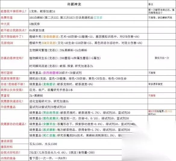 更多内容请点击: 最强蜗牛神龙许愿怎么玩 一、龙珠获取途径: 抽奖、地图探索、博物馆1000勋章兑换、活动(许愿周3600灰烬兑换)。 二、神龙攻略: 每献祭5次龙珠,就会出现一次真神龙,一共能出现3次。 1、真神龙第一次出现:大客户礼包(2000白蝌蚪、50k黑蝌蚪、5许愿币)、低等龙晶(100绿试剂、100蓝试剂)。 2、真神龙第二次出现:大客户礼包(2000白蝌蚪、50k黑蝌蚪、5许愿币)、红龙蛋(孵化巨龙儿孙)。 注:真神龙出现的第二次会给红龙蛋,把蛋吃了之后,龙妈会找上门。 3、真神龙第三次出现:红龙鳞(14号器官:移植后,所有龙类儿孙防御+10%)、获得1800巨龙进化点、 注:真神龙出现的第三次,会被蛞蝓龙暗杀,然后神龙二世会来。 4、第16次献祭龙珠之后会获得:3个大客户礼包(1000白蝌蚪、20k黑蝌蚪、2许愿币)。 三、装备:红龙角 基本属性:攻击+40、敏捷+60 巨龙形态下:攻击+48、敏捷+72 神龙许愿奖励一览