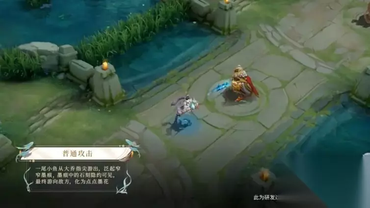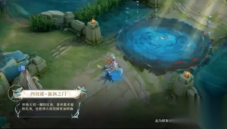 一技能比较有意思,释放出去,会有一黑一白两条小鱼游向远方,然后地面会留下两排小字。看不清是什么字,期待后续皮肤的背景故事。