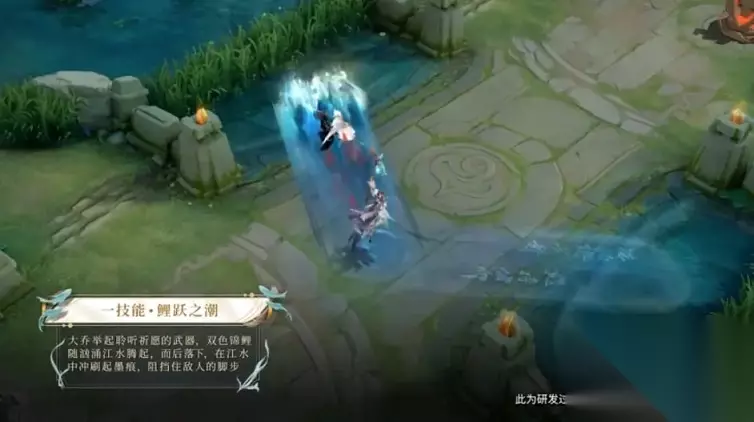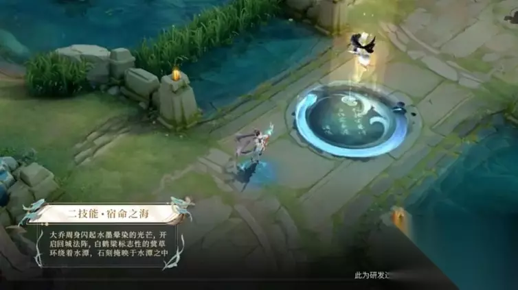 二技能宿命之海,应该是最花哨的了,地面一个圆圈,有水浪图案,还有文字浮现,光柱笼罩之下,一黑一白两条小鱼浮在空中嬉戏。这是白鹤梁标志性的双鱼含草,也就是石鱼含着蓂草。底下的文字是石刻上面的。还是看不清上面字。