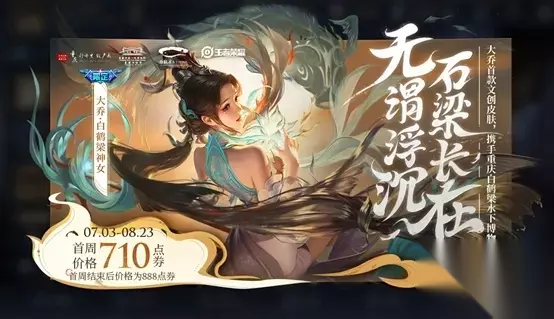 王者荣耀大乔白鹤梁神女为史诗限定皮肤,7月3日上线,首周价格710点券,技能特效融入白鹤梁石鱼、石刻等元素。同期还有南京Hero久竞冠军纪念活动,含皮肤折扣、宝箱掉落永久英雄皮肤等福利。