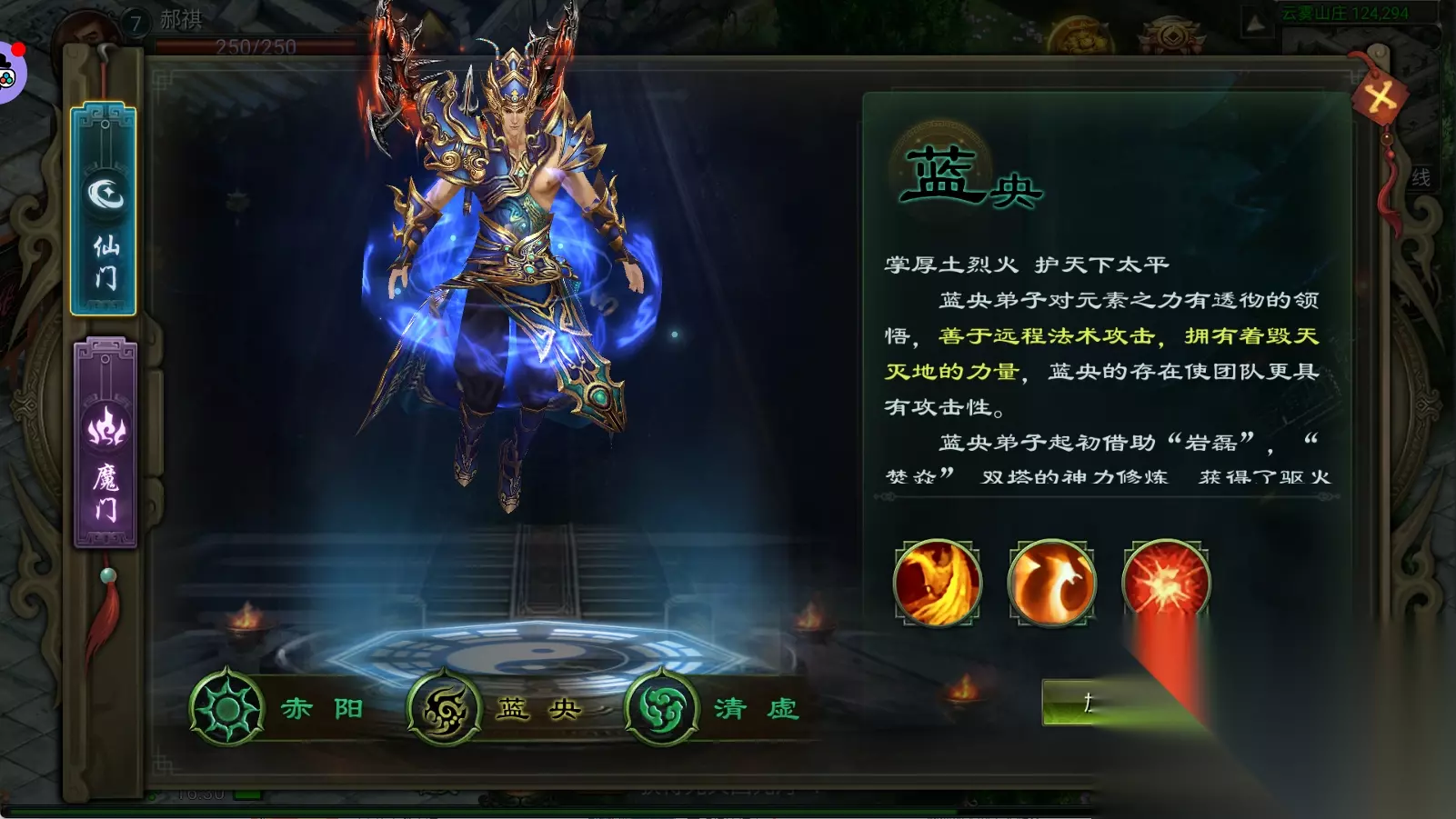 技能解析 蓝央的技能以火属性和土属性为主,包括: • 焱诀系列:火狱诀、炼狱诀、爆裂诀,这些技能对目标造成伤害,并附带燃烧效果,每2秒对目标造成伤害,持续4次。 • 天火阵:在目标范围设下燃烧法阵,每秒造成伤害,持续8秒,适合团战中大面积铺设。 • 盘龙锁:对目标造成伤害并击退,可用于打断敌人进攻或快速拉开距离。 • 清心静气:增加自身及周围友军的攻击力,持续15秒,提升团队输出能力。 • 岩突与玄武震击:对敌军造成伤害并减速,控制敌人移动,为队友创造输出机会。
